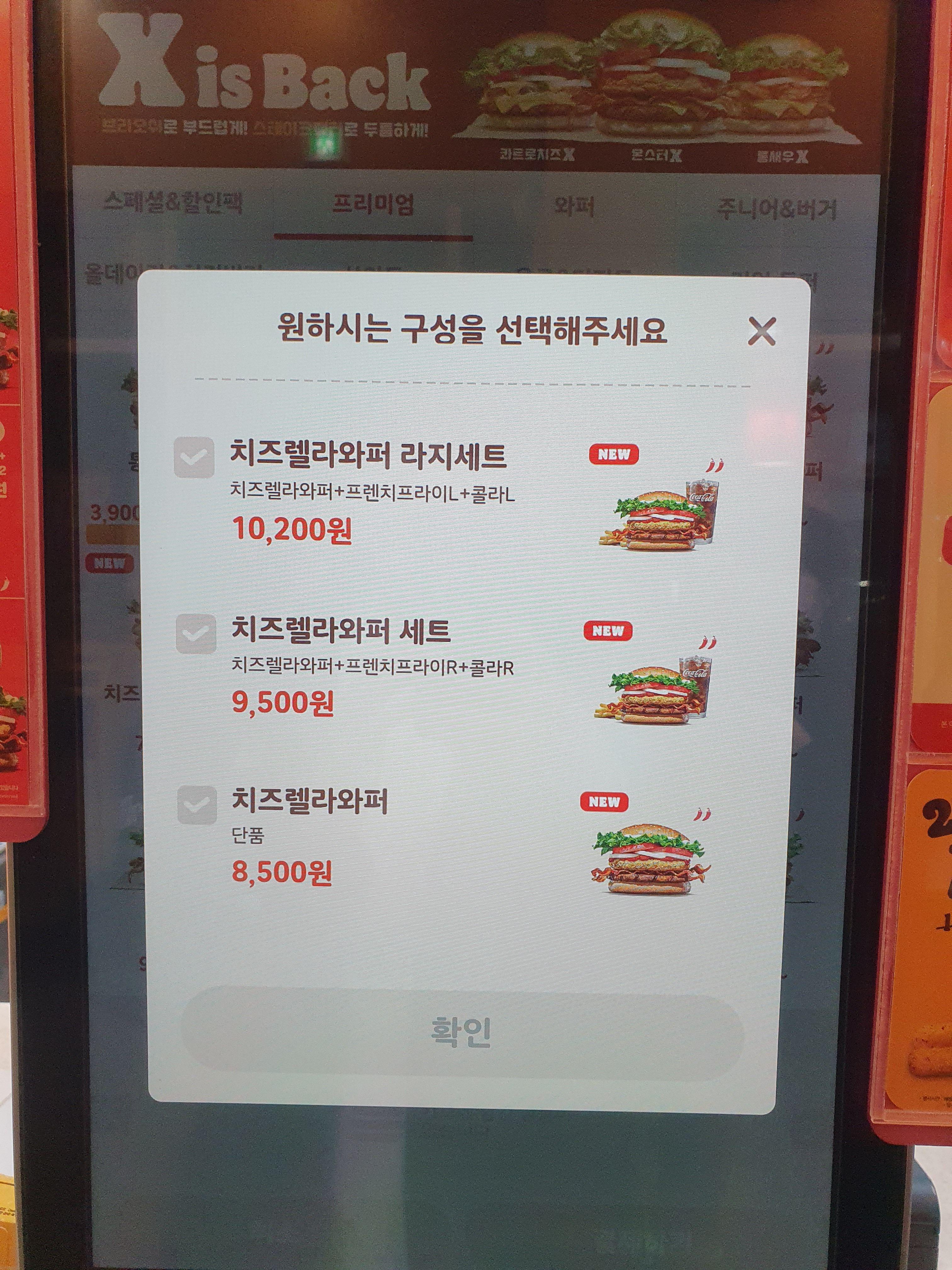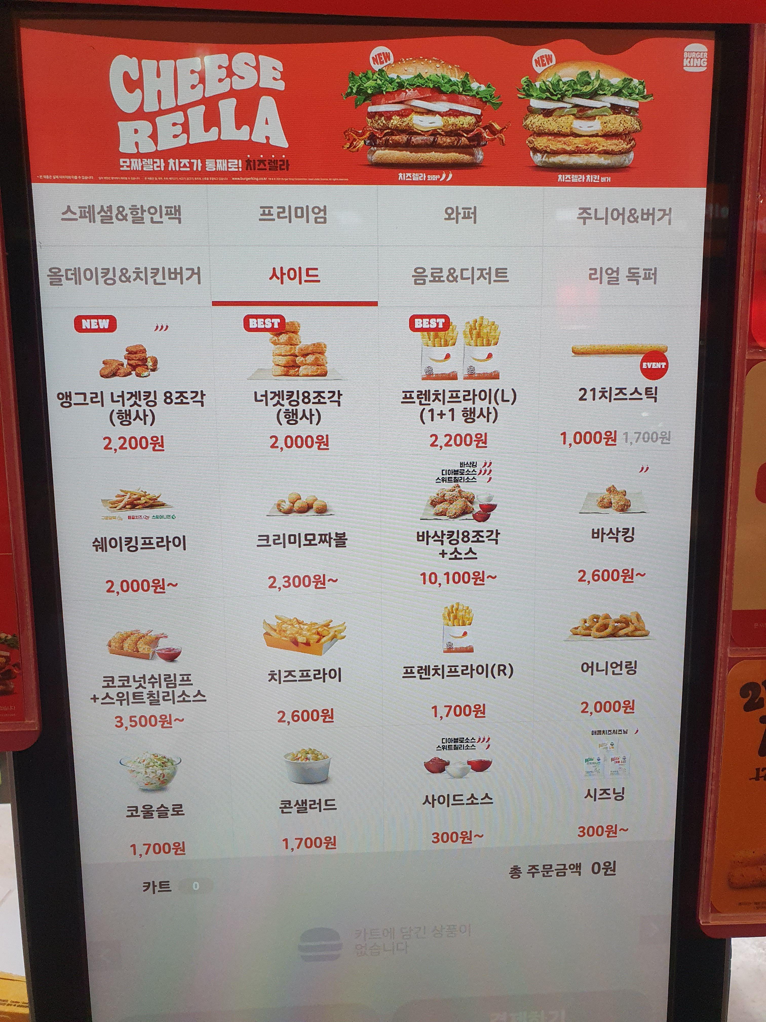 메뉴를 보는중 매콤한 게 끌리고 NEW라고 쓰여있는 치즈렐라와퍼 세트 2개 주문!!