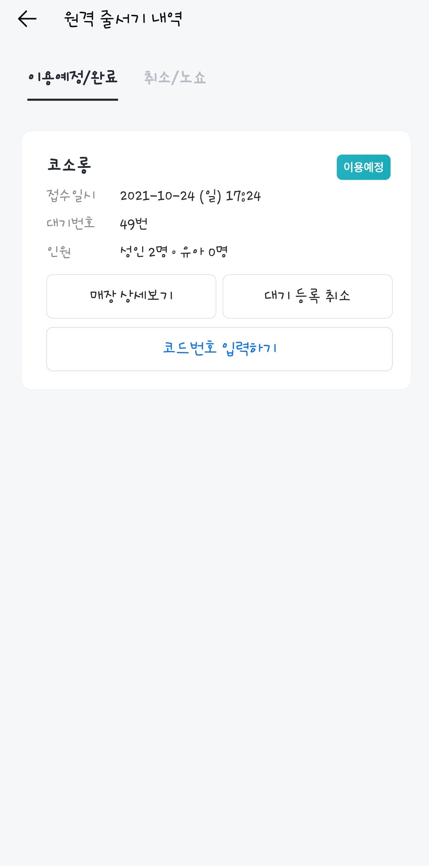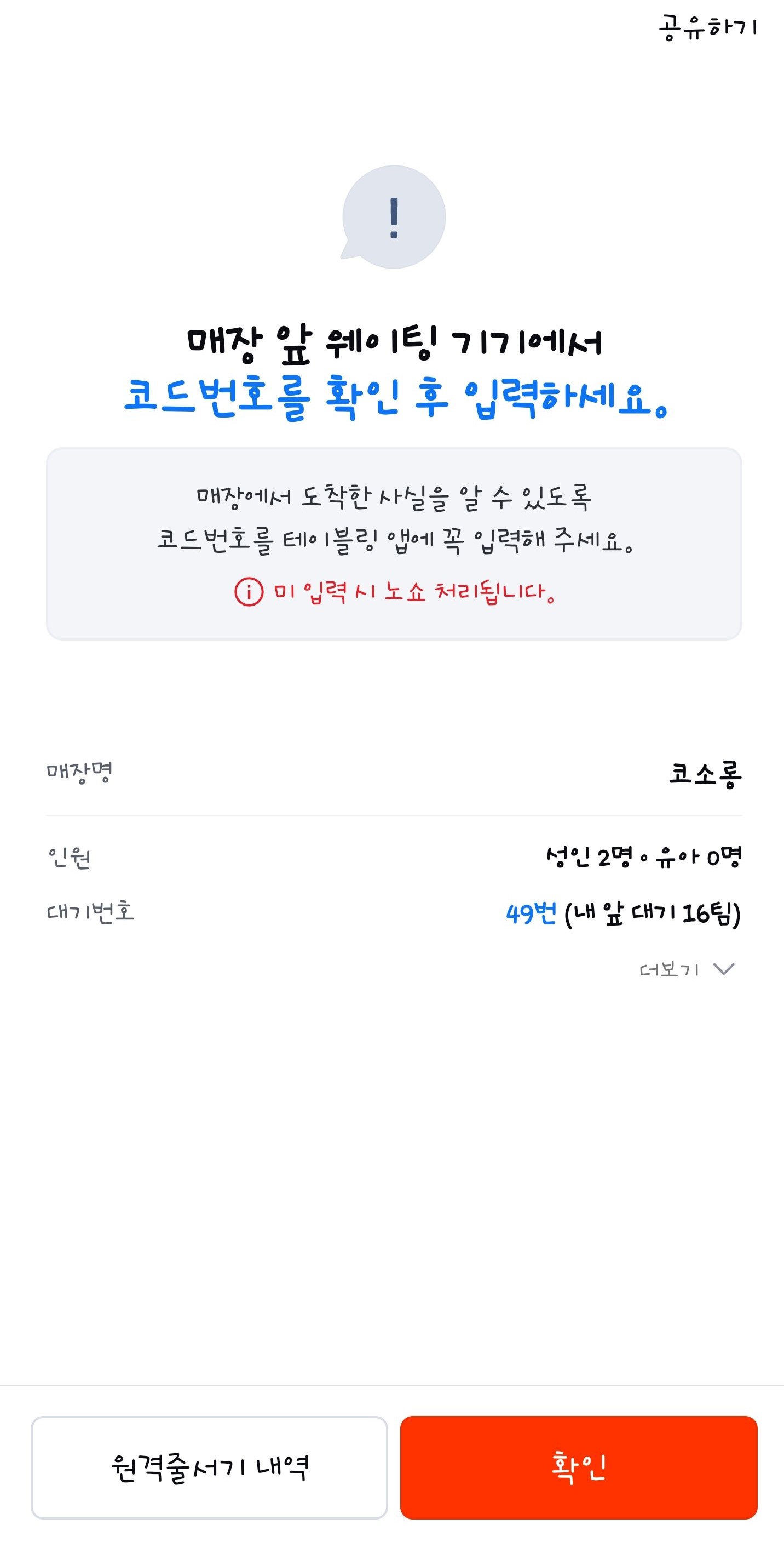 도착 후 매장에 들어가서 코드 입력하면 원격 줄 서기가 완료됩니다 :)