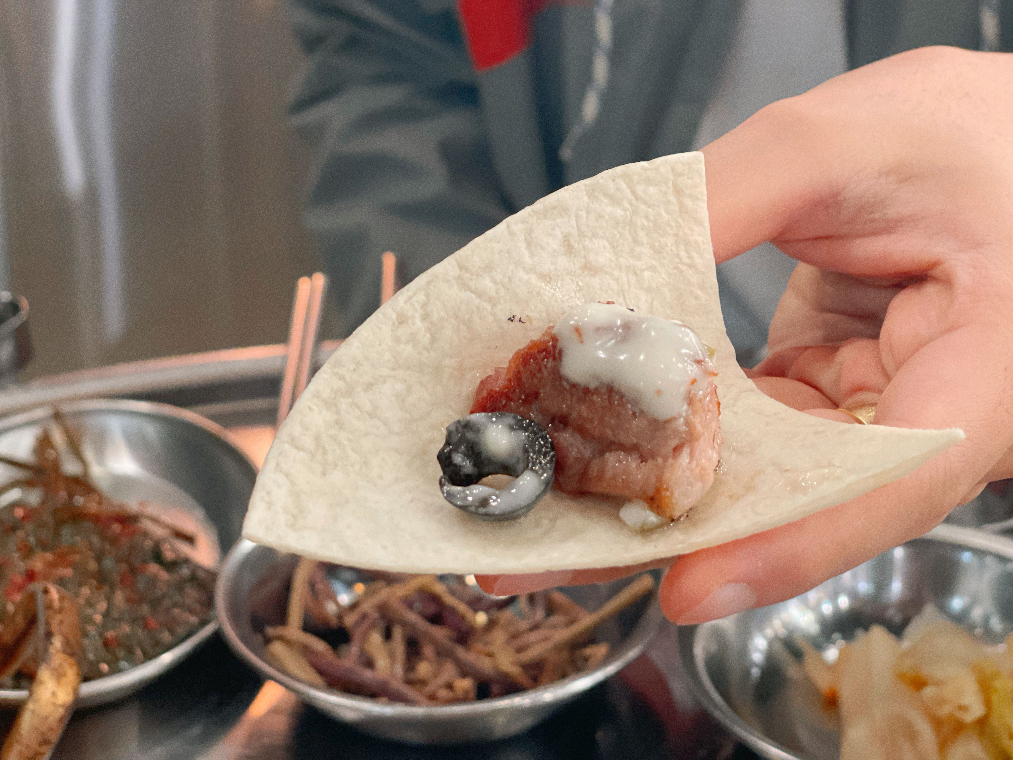 또띠아에 가운데에 있는 목살 부분과 블랙 올리브, 소스를 얹어 먹으면 된다고 해요