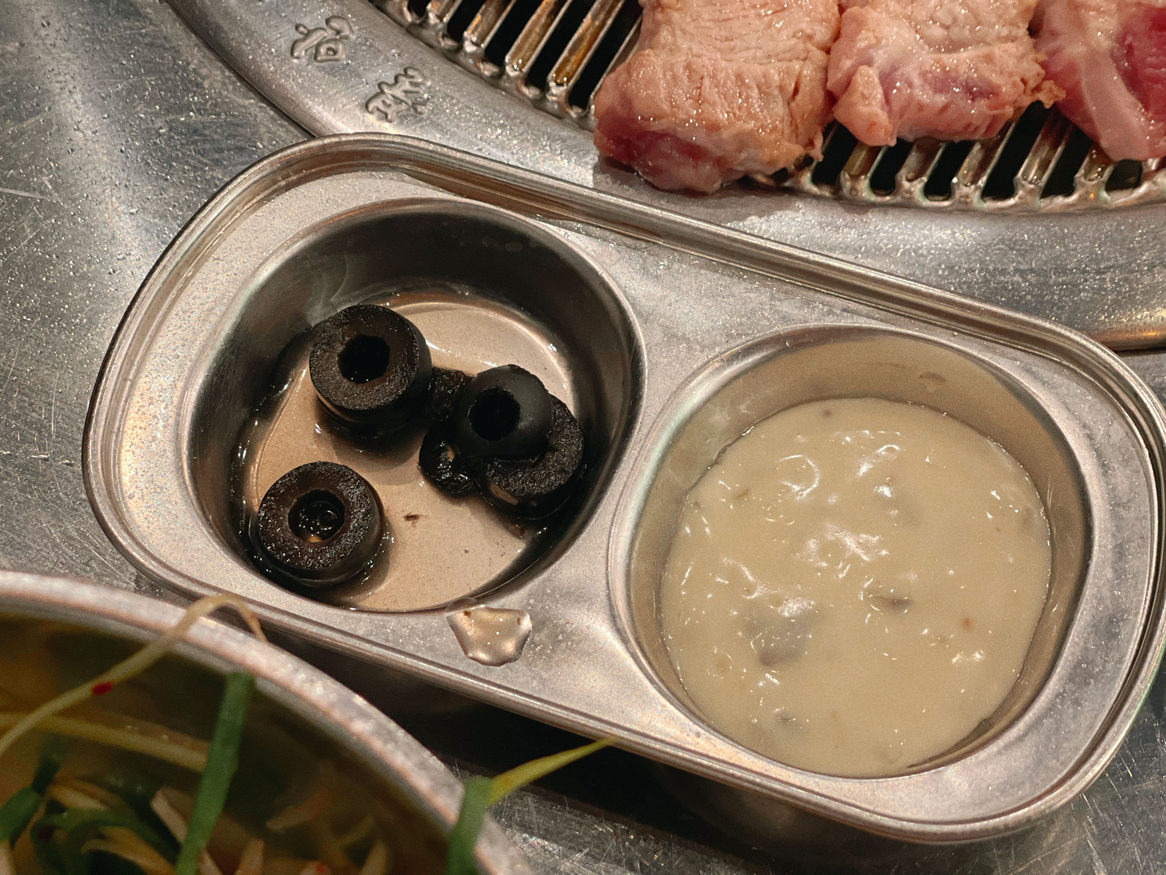 또띠아에 가운데에 있는 목살 부분과 블랙 올리브, 소스를 얹어 먹으면 된다고 해요